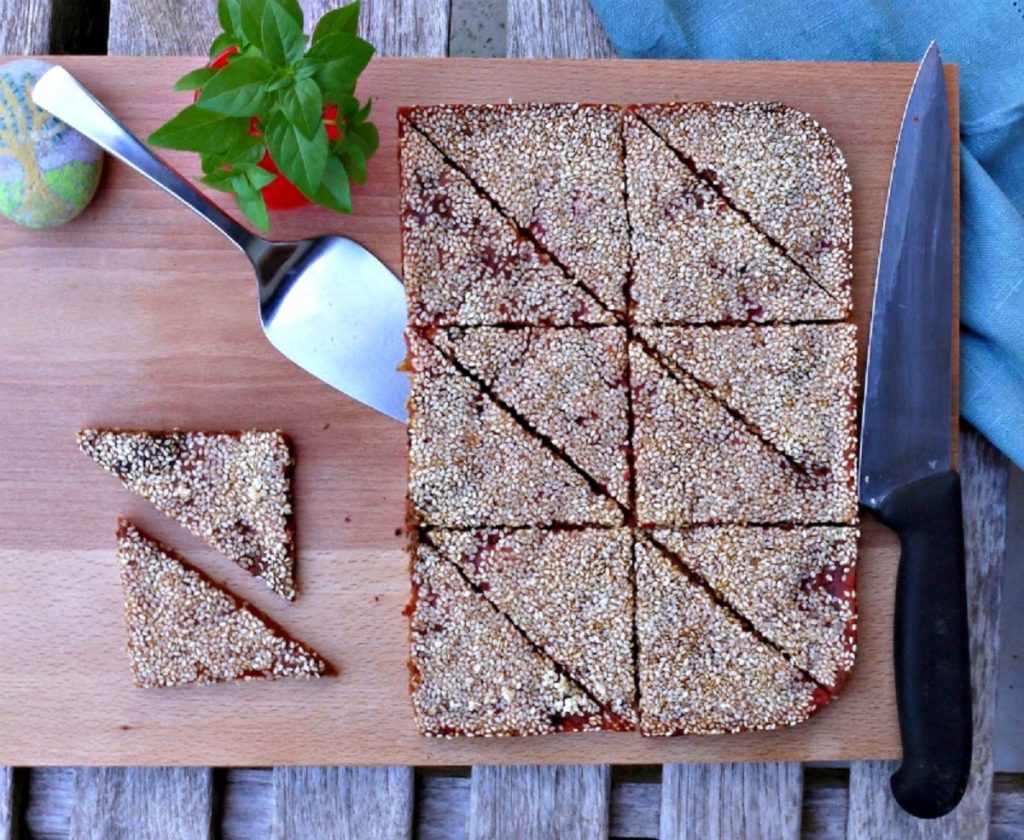 Λαδώνετε πολύ καλά το ταψί του φούρνου στη βάση και τα τοιχώματα. Πασπαλίζετε με το μισό σουσάμι και με κουτάλα αδειάζετε ομοιόμορφα το μείγμα. Το ύψος του δεν πρέπει να υπερβαίνει το 1.5 εκατ.