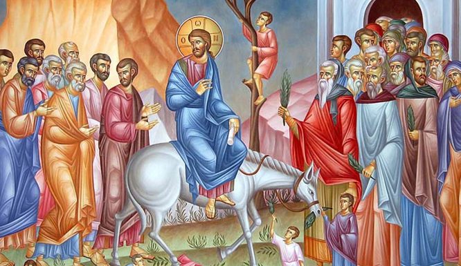 Ο Χριστός εισέρχεται στα Ιεροσόλυμα «επί πώλον όνου». Πορεύεται και οι Ισραηλίτες τον υποδέχονται με τιμές ως Βασιλιά. Εκείνος δεν δίνει ιδιαίτερη σημασία στις τιμές, δεν περιορίζεται στο πανηγύρι, στην πρόσκαιρη δόξα, αλλά προχωρεί στο σταυρό και την Ανάσταση.