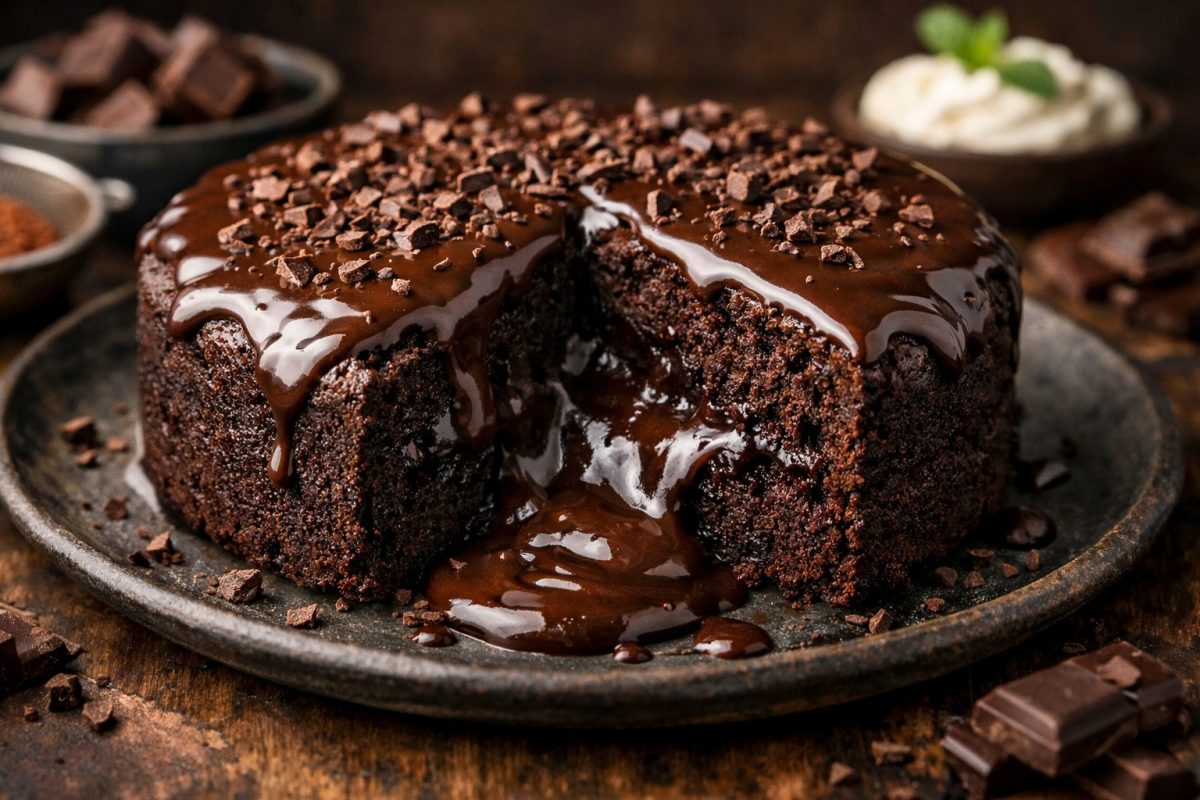 Αυτή η σοκολοτόπιτα έχει την τέλεια αναλογία σε σιρόπι, έτσι ώστε να μην παθαίνεις και ζάχαρο…Μην παραλείψετε να κοσκίνισε όλα τα υλικά σας πριν τα ανακατέψετε, για να είναι πιο αφράτη η ζύμη σας . Για να απογειώσετε την ήδη πλούσια γεύση της, μπορείτε αφού το σερβίρετε να το πασπαλίσετε και με λίγους ξηρούς καρπούς ψιλοκομμένους.
