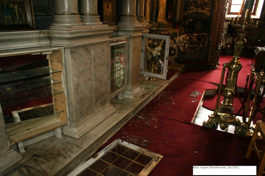 Οι εισβολείς δεν αρκέστηκαν στους σταυρούς που ξήλωσαν από τα μνήματα και τα μπρούτζινα καντήλια, αλλά πήραν ακόμη και το λάδι που άφηναν οι συγγενείς για να τα ανάβουν. Έκλεψαν ακόμη και μερικά μπουκάλια με μαυροδάφνη, αλλά και τα… κεριά! Στη συνέχεια παραβίασαν την πλαϊνή πόρτα του μικρού ναού και διέρρηξαν το παγκάρι αναζητώντας χρήματα. Όμως, δεν υπήρχαν μέσα παρά ελάχιστα κέρματα και ερεύνησαν την εκκλησία για μεταλλικά αντικείμενα, χωρίς να βρουν κάτι για να αρπάξουν.