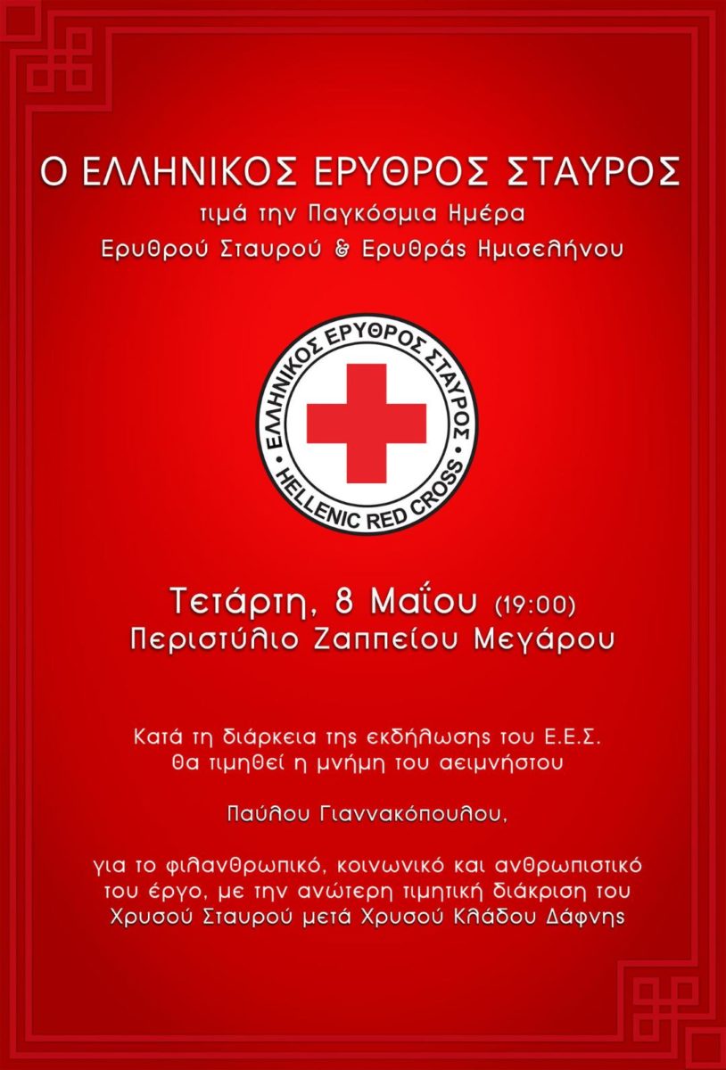 Ο Ελληνικός Ερυθρός Σταυρός(Ε.Ε.Σ), την Τετάρτη 8 Μαΐου 2024 με αφορμή την Παγκόσμια Ημέρα Ερυθρού Σταυρού & Ερυθράς Ημισελήνου, διοργανώνειμεγάλη εκδήλωση, σε ανάμνηση της ημερομηνίας γέννησης του μεγάλου ακτιβιστή, ιδεολόγου και ιδρυτή του Ερυθρού Σταυρού, Ερρίκου Ντυνάν. Η εκδήλωση του Ε.Ε.Σ θα πραγματοποιηθεί τηνΤετάρτη 8 Μαΐου, στις 7 μ.μ., στο Περιστύλιο του Ζαππείου Μεγάρου.H είσοδος του κόσμου θα πραγματοποιείται ΜΟΝΟ από την οδό Βασιλίσσης Αμαλίας.