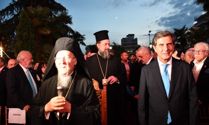 Τον Οικουμενικό Πατριάρχη υποδέχτηκε στον κατάμεστο από ιεράρχες και πιστούς προαύλειο χώρο του Διοικητηρίου ο Υφυπουργός Εσωτερικών, αρμόδιος για θέματα Μακεδονίας και Θράκης, Κωνσταντίνος Γκιουλέκας.