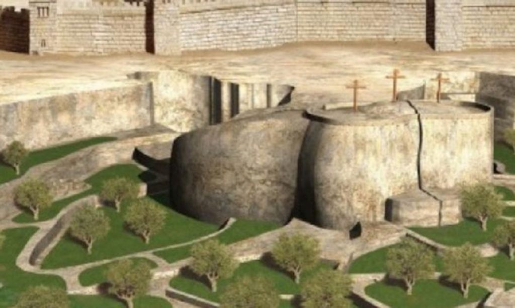 Ο βράχος του Γολγοθά την εποχή του Χριστού μέσα στους κήπους-οπωρώνες του αρχαίου λατομείου (κοιτάζουμε ανατολικά).