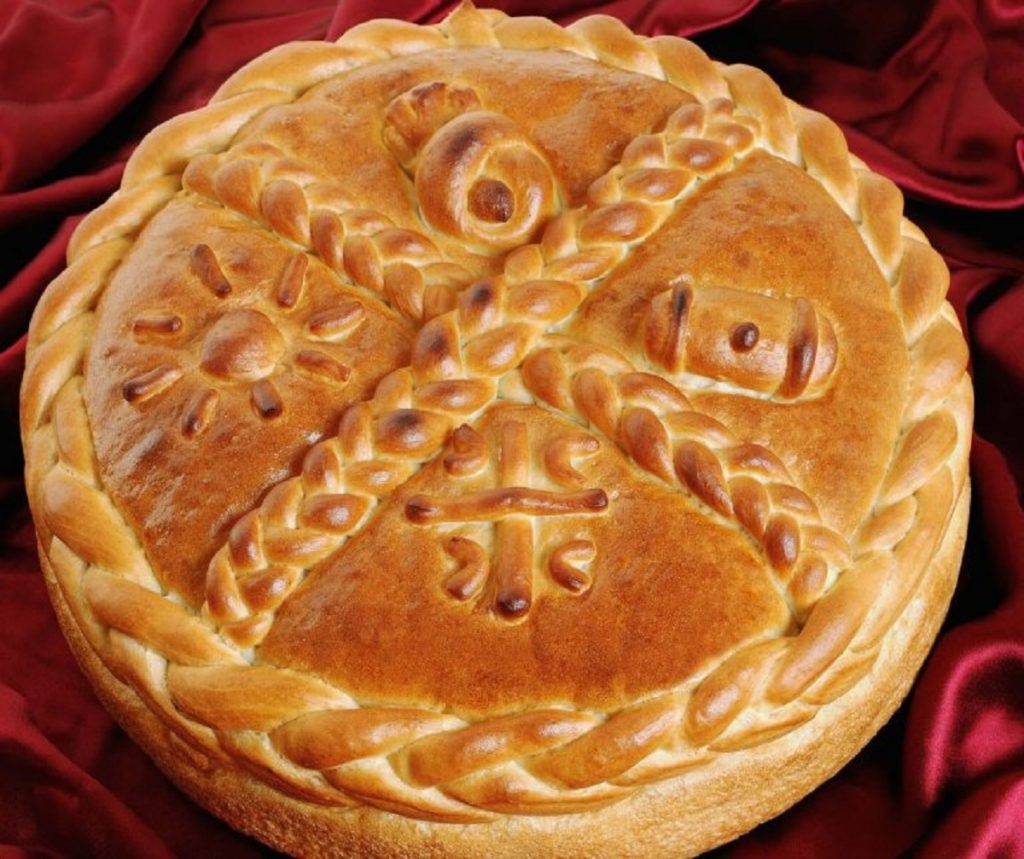 Στη συνέχεια βουτυρώνουμε ένα ταψάκι και το αλευρώνουμε τινάζοντας να φύγει η περισσή ποσότητα. Βάζουμε μέσα τη ζύμη μας και με λίγο ζυμάρι που έχουμε κρατήσει φτιάχνουμε δύο κορδόνια τα οποία τοποθετούμε πάνω στο ψωμί σε σχήμα Σταυρού. Στολίζουμε με καρύδια ή αμύγδαλα, πασπαλίζουμε με το σουσάμι και βάζουμε να ψηθεί σε προθερμασμένο φούρνο στους 180 βαθμούς για περίπου μια ώρα.