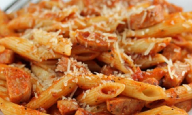 Βράζετε τα ζυμαρικά σύμφωνα με τις αναγραφόμενες οδηγίες της συσκευασίας. Όταν είναι έτοιμα, τα βγάζετε και τα σουρώνετε. Σε ένα αντικολλητικό τηγάνι ρίχνετε λίγο ελαιόλαδο και προσθέτετε το λουκάνικο κομμένο σε φετούλες και το ψήνετε για 5 λεπετά μέχρι να ροδίσει.