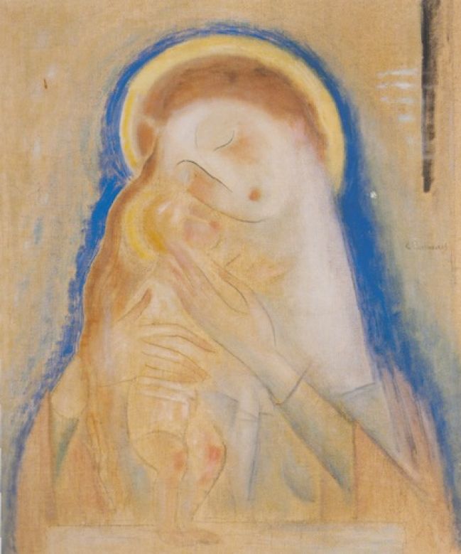 Ο πίνακας αυτός, που κοσμεί τη βιβλιοθήκη, φέρει τίτλο «Παναγία με τον Χριστό» και είναι καμωμένος από το χέρι του Κωστή Παρθένη. Η σημασία της τοποθέτησης του έργου, δεν είναι μόνο θρησκευτικού χαρακτήρα.