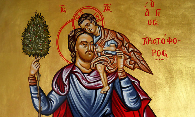 Για το λόγο αυτό, ο Άγιος Χριστόφορος ζωγραφίζεται περνώντας το ποτάμι, στηριζόμενος στο ξύλο και με το παιδίον – Χριστό στον ώμο.