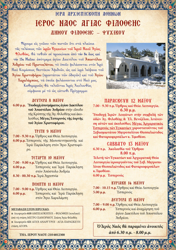 Το ιερό λείψανο του Αγίου Χριστοφόρου που φυλάσσεται στον ιερό ναό Αγίας Φιλοθέης Δήμου Φιλοθέης – Ψυχικού θα τίθεται προς προσκύνηση από Δευτέρα 8 έως Δευτέρα 15 Μαΐου, στο πλαίσιο των εορταστικών εκδηλώσεων για τα εγκαίνια του ιερού ναού που θα τελεσθούν 13 του μηνός.