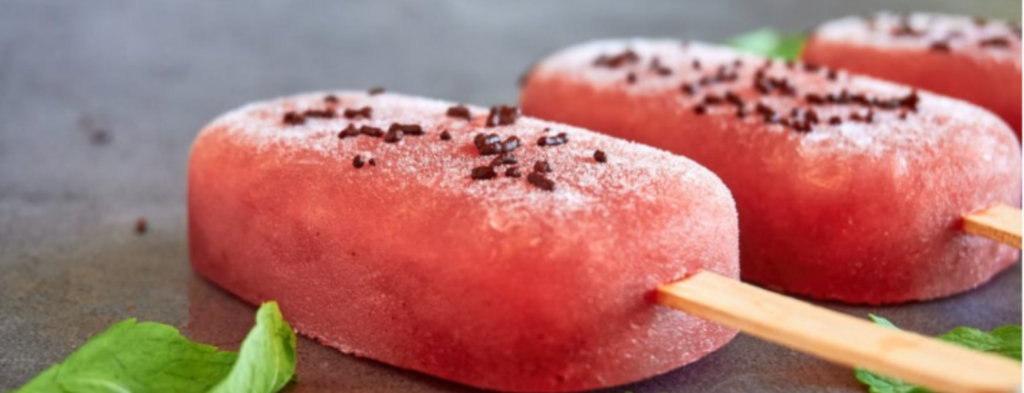 Ανακατεύουμε το σιρόπι και το χυμό λεμονιού. Τοποθετούμε το καρπούζι μαζί με τη μισή ποσότητα του σιροπιού σ’ ένα μπλεντεράκι και χτυπάμε μέχρι να έχουμε ένα ομογενοποιημένο μίγμα. Αδειάζουμε το μίγμα στις θήκες παγωτού μέχρι τη μέση. Βάζουμε στην κατάψυξη για περίπου 2 ώρες. Μετά από 2 ώρες τοποθετούμε το πεπόνι μαζί με το υπόλοιπο σιρόπι στο μπλεντεράκι και χτυπάμε μέχρι να γίνει και αυτό ένα ομογενοποημένο μίγμα. Βγάζουμε τις θήκες από τη κατάψυξη και χώνουμε στο κέντρο τα ξυλάκια. Με προσοχή ρίχνουμε και το μίγμα μας από το πεπόνι. Ξαναβάζουμε στην κατάψυξη γρήγορα και αφήνουμε για τουλάχιστον 4 ώρες!