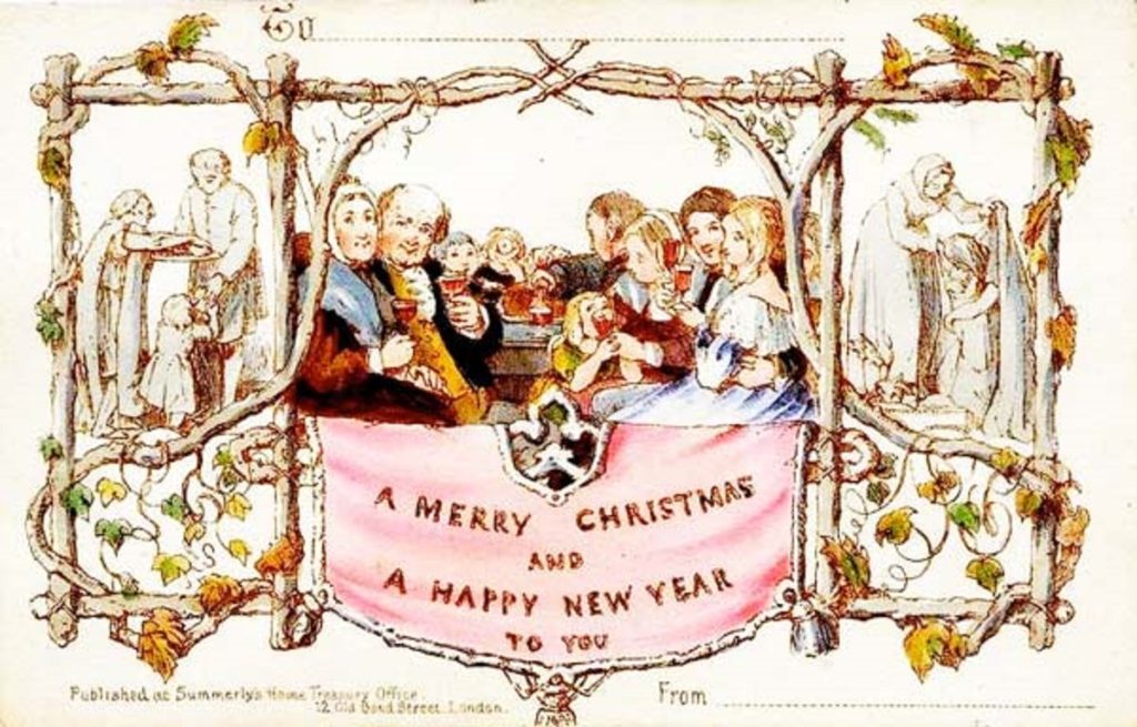 Λιθογραφήθηκε σε χοντρό χαρτόνι, 5 1/8 επί 3 1/4 inches, σε σκούρα σέπια και ζωγραφίστηκε με το χέρι. Το κέντρο της κάρτας έδειχνε ένα οικογενειακό πάρτι σε εξέλιξη, κάτω από το οποίο υπήρχαν οι λέξεις «Χαρούμενα Χριστούγεννα και Ευτυχισμένο το Νέο Έτος». Στη μία πλευρά υπάρχει μία σκηνή που ταίζουν κάποιον πεινασμένο και στην άλλη μία σκηνή που ντύνουν τους φτωχούς. Στις ΗΠΑ, ο κύριος Pease, ιδιοκτήτης ενός καταστήματος στο Albany της Ν. Υόρκης, κατασκεύασε στα μέσα του 19ου αιώνα μία κάρτα με «Χριστουγεννιάτικες ευχές από το μεγάλο κατάστημα του Pease, το ναό της μόδας».