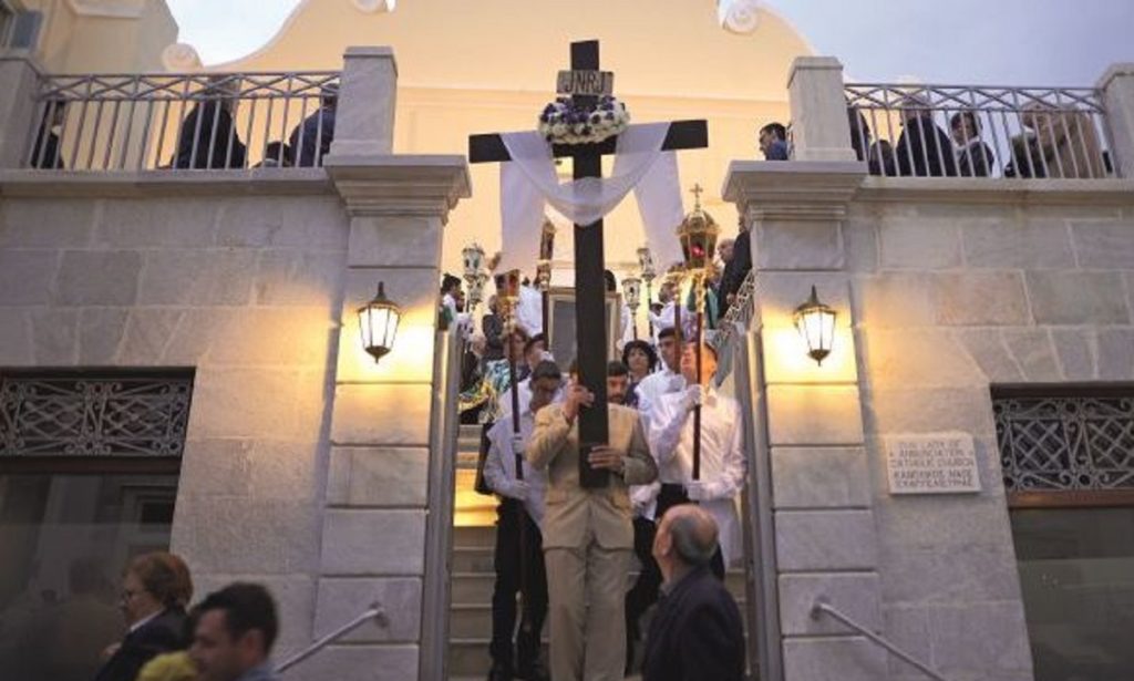 Από τους ορθόδοξους ναούς του Αγίου Νικολάου, της Κοίμησης της Θεοτόκου και της Μεταμόρφωσης του Σωτήρος πορεύονται αυτοί των ορθοδόξων για να συναντηθούν όλοι μαζί στην πλατεία Μιαούλη, μπροστά στο Δημαρχείο όπου ψάλλονται τροπάρια της Μεγάλης Παρασκευής από τη χορωδία της ορθόδοξης ενορίας του Αγίου Νικολάου, δημιουργώντας μια συγκινητική ατμόσφαιρα.