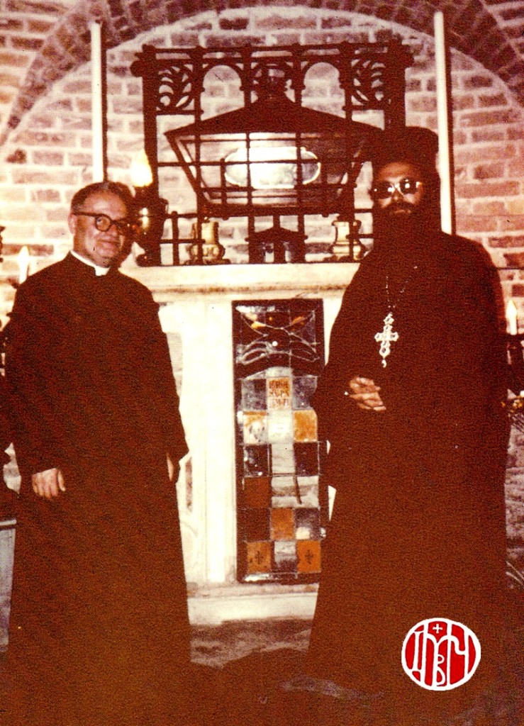 Ενώπιον της λάρνακος των ιερών λειψάνων του αγίου Δημητρίου με τον προϊστάμενο του Αββαείου don Araldo Angeloni (1978)
