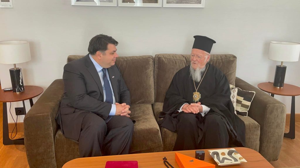Ο Οικουμενικός Πατριάρχης κ. Βαρθολομαίος, ο οποίος πραγματοποιεί επίσκεψη στη Θεσσαλονίκη, δέχθηκε στο κατάλυμά του τον Ελληνοαμερικανό νέο Πρέσβη των Η.Π.Α. στην Ελλάδα κ. George J. Tsunis, ο οποίος κατά το παρελθόν τιμήθηκε με το οφφίκιο του Άρχοντος της Μ.τ.Χ.Ε. , μαζί με την Γεν. Πρόξενο στη Θεσσαλονίκη Ευγεν. κ. Elisabeth Lee.