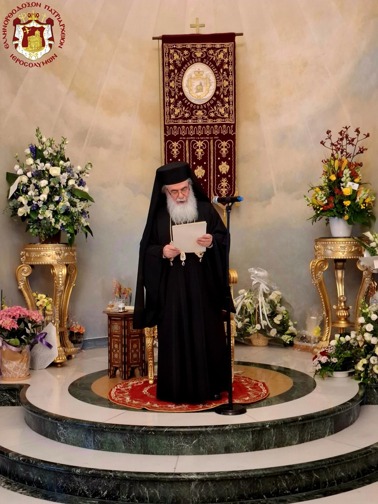 Τά τελετουργικά ὀφειλόμενα τῷ ἁγίῳ Θεοφίλῳ καί τῇ Ὑμετέρᾳ Μακαριότητι ἐν τῷ Ναῷ πληρώσαντες, εἴμεθα νῦν συνηγμένοι εἰς τό ἱερόν τοῦτο “ὀσπίτιον” τοῦ Πατριαρχείου, ἵνα ἀποδώσωμεν Αὐτῇ τόν δίκαιον ἔπαινον ἐπί πᾶσιν, ἅτινα Αὕτη προσέφερε καί προσφέρει τῇ Ἁγιοταφιτικῇ ἡμῶν Ἀδελφότητι, τῷ Πατριαρχείῳ καί τῇ Ὀρθοδόξῳ Ἐκκλησίᾳ ὅλῃ, ἐν ταῖς προσπαθείαις Αὐτῆς δι’ ἐπανέναρξιν διαλόγου διά τήν ἐπανεύρεσιν τῆς ἐν Χριστῷ ἑνότητος τῶν Ὀρθοδόξων Ἐκκλησιῶν, ὅπερ καί πάλιν ἐτόνισε κατά τήν πρό τινος συμμετοχήν Αὐτῆς εἰς τήν Νεκρώσιμον Ἀκολουθίαν τοῦ μακαριστοῦ Ἀρχιεπισκόπου Ἀλβανίας κυροῦ Ἀναστασίου.