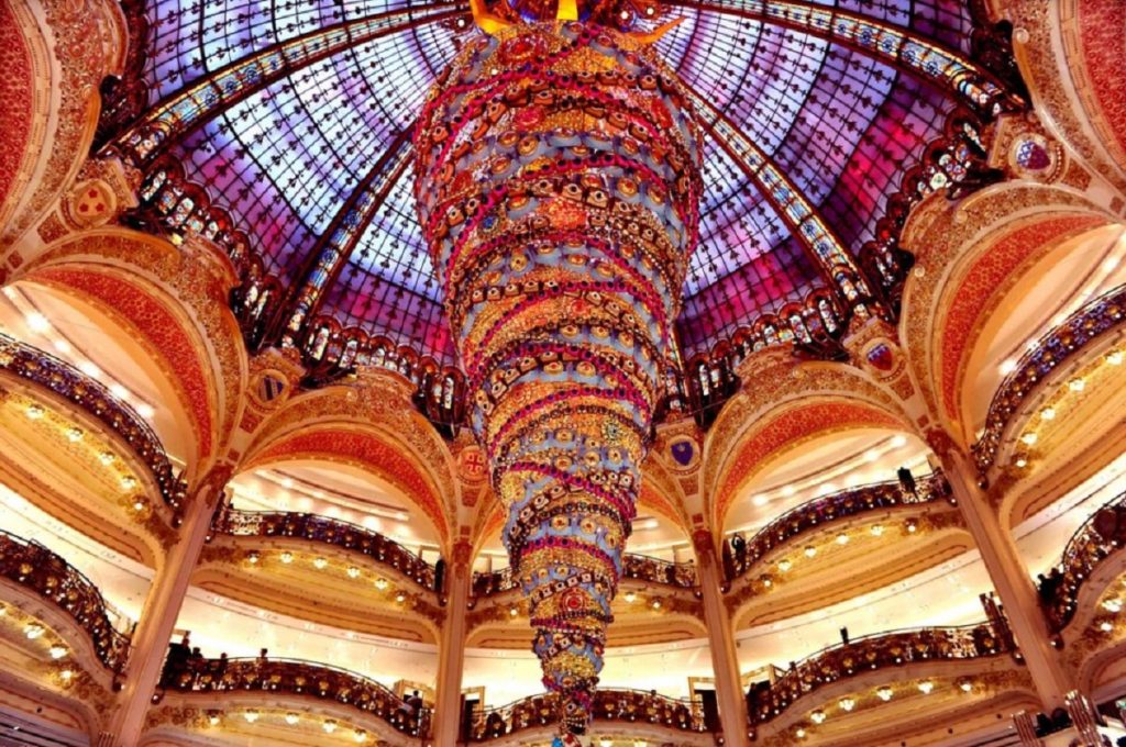 Σπάζοντας την παράδοση, το πολυτελές δέντρο που κρεμάστηκε από την οροφή του παριζιάνικου εμπορικού κέντρου, εμοιάζει να ίπταται πάνω από τα κεφάλια των επισκεπτών. Το 25 μέτρων ύψους ανάποδο δέντρο, υπήρξε ένα πρωτότυπο θέαμα, το οποίο κάθε άλλο παρά απαρατήρητο πέρασε