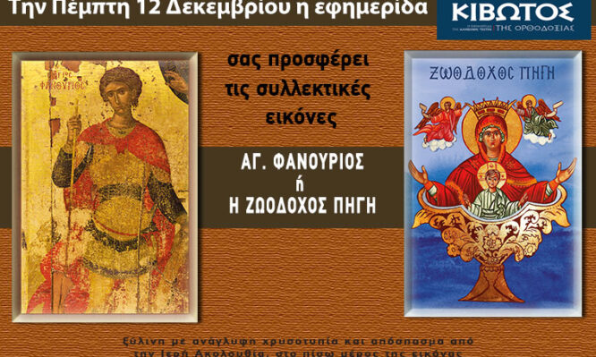 Την Πέμπτη 12 Δεκεμβρίου η εφημερίδα Κιβωτός της Ορθοδοξίας κατόπιν μεγάλης ζήτησης επανακυκλοφορεί δυο συλλεκτικές εικόνες για να επιλέξετε Ο ΑΓΙΟΣ ΦΑΝΟΥΡΙΟΣ αντίγραφο αγιογραφίας του 15ου αιώνα Αγ. Αικατερίνη Ηράκλειο Κρήτης Οὐράνιον ἐφύμνιον ἐν γῇ τελεῖται λαμπρῶς, ἐπίγειον πανήγυριν νῦν ἑορτάζει φαιδρῶς, Ἀγγέλων πολίτευμα. Ἄνωθεν ὑμνωδίαις, εὐφημοῦσι τούς ἄθλους, κάτωθεν Ἐκκλησία τήν […]