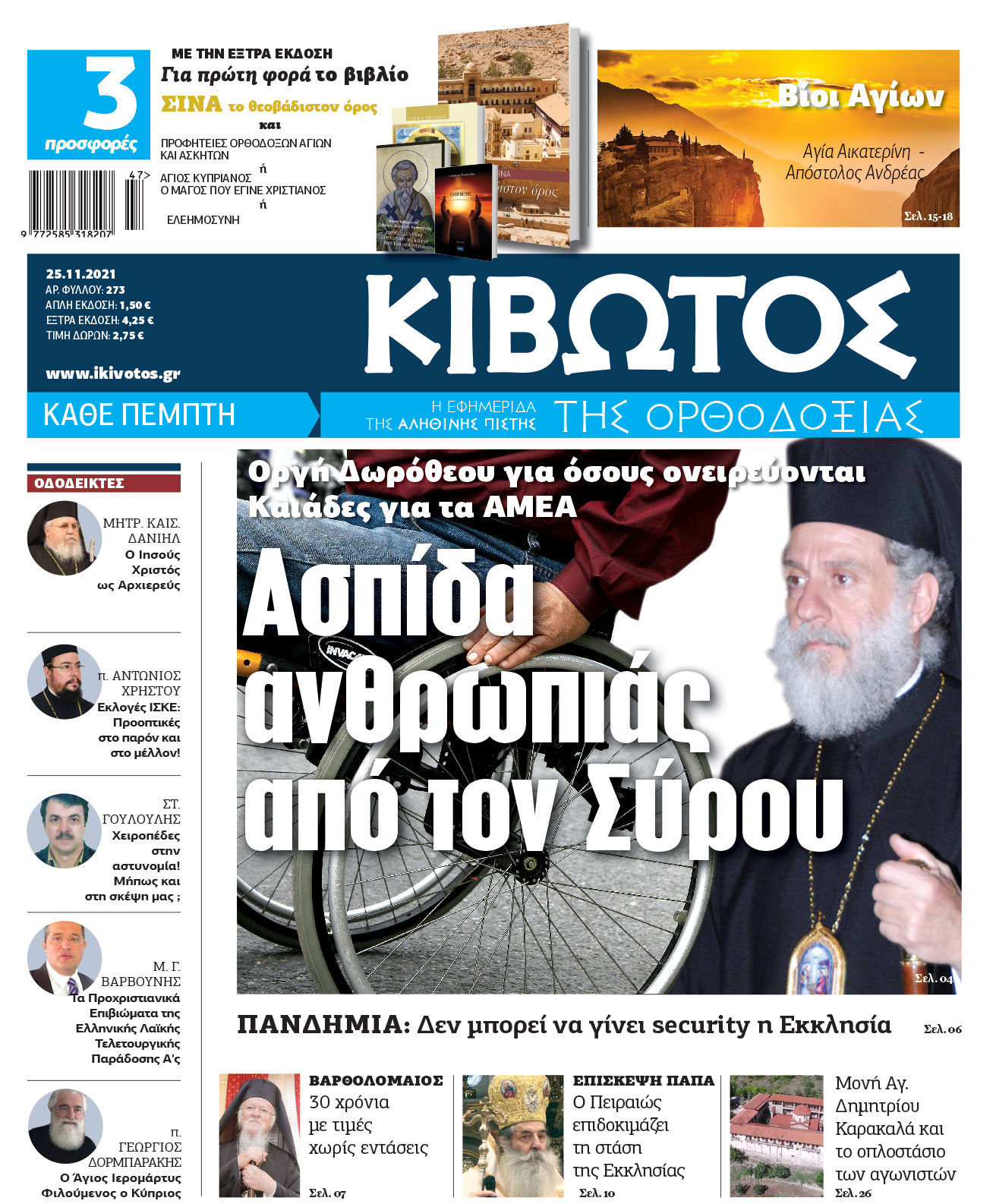 Την Πέμπτη, 25 Νοεμβρίου 2021, κυκλοφορεί το νέο φύλλο της Εφημερίδας «Κιβωτός της Ορθοδοξίας»