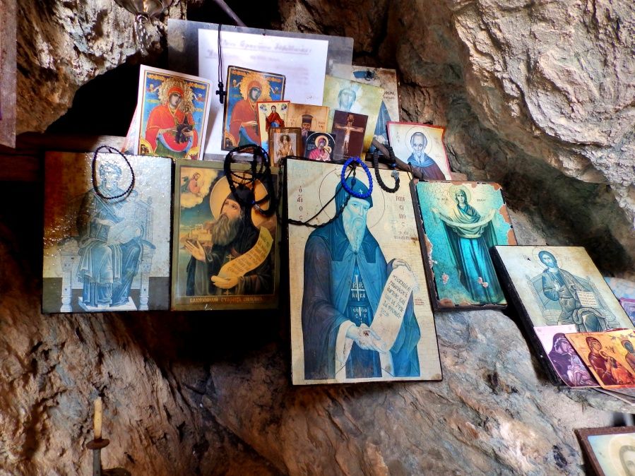 Από τη Σκήτη της Αγίας Άννας προς την Μικρή Αγία Άννα, παίρνοντας το μονοπάτι, ο προσκυνητής θα αντικρίσει πολλά τέτοια μικρά ασκηταριά και σπήλαια, άλλα γνωστά, άλλα πιότερο βυθισμένα στη λησμοσύνη και άγνοια των νεοτέρων, μοναχών και λαϊκών. Περίπου, στη μέση της ως άνω διαδρομής, ο προσκυνητής συναντά ένα μικρό σπήλαιο με προσκυνητάρι, όπου δεσπόζει η εικόνα της Υπεραγίας Θεοτόκου. Έχει και αυτό, όπως και τα άλλα προσκυνητάρια, την ιστορία του.