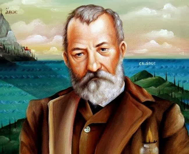 Εἶχεν εἰσέλθει ἄνθρωπος ὑψηλός, καλοφορεμένος, ὡς σαράντα πέντε ἐτῶν, ὡραῖος, ἀνοικτοπρόσωπος, ἐξυρισμένος μύστακα καὶ γένειον, πλὴν ὀλίγον τριχῶν ὑπὸ τὸν πώγωνα καὶ πρὸς τὸν λαιμόν, μὲ παχεῖαν χρυσὴν καδένα ἐπὶ τοῦ στήθους…»