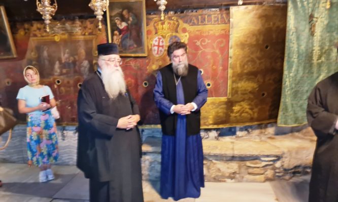 Πρῶτο προσκύνημά μας, τήν ἴδια ἡμέρα τό ἀπόγευμα, ὑπήρξε ἡ ἁγία πόλη τῆς Βηθλεὲμ καὶ ἡ Βασιλικὴ τῆς Γεννήσεως. Ὁ περικαλλὴς Ναὸς ποὺ κτίσθηκε καὶ ἐξωραΐσθηκε μὲ τὴν φροντίδα τῶν ἁγίων θεοστέπτων βασιλέων καὶ ἱσαποστόλων Κων/νου καὶ Ἑλένης, ἀγκαλιάζει στοργικὰ τὸ «θεοδέγμον σπήλαιον», τὸν τόπο ποὺ γεννήθηκε ὁ θεάνθρωπος Κύριός μας. Μετὰ τὴν ἐγκάρδια ἀρχιερατικὴ ὑποδοχὴ στὸ Καθολικὸ τοῦ Ναοῦ ἀπὸ τὸν Πατριαρχικό Ἐπίτροπο, Σεβ. Μητροπολίτη Διοκαισαρείας κ. Βενέδικτο, συμφώνως πρὸς τὴν τάξη τῆς Ἐκκλησίας τῶν Ἱεροσολύμων, κατευθυνθήκαμε λιτανευτικῶς πρὸς τὸν ἱερὸ τόπο ποὺ γεννήθηκε ὁ Σωτήρας τοῦ κόσμου, ψάλλοντας τροπάρια ἀπὸ τὴν ἀκολουθία τῶν Χριστουγέννων. Ὁ Σεβ. Μητροπολίτης Καλαβρύτων καὶ Αἰγιαλείας κ. Ἱερώνυμος, ὁ ὁποῖος ὡς Ἐπίσκοπος ἐπισκεπτόταν γιά πρώτη φορά τά Πανάγια προσκυνήματα, ἀνέγνωσε μέ ἔκδηλη συγκίνηση τὸ ἱερὸ Εὐαγγέλιο τῆς Γεννήσεως τοῦ Κυρίου. Ὄλοι μας ἀναλογιζόμαστε ὄχι μόνο τὴν μεγάλη εὐλογία τοῦ προσκυνήματος αὐτοῦ, ἀλλὰ καὶ τὴν τιμή, νὰ μᾶς ὑποδέχεται ὁ Κύριός μας ἐντὸς τῆς πρώτης ταπεινῆς «οἰκίας» Του στήν γῆ.