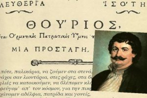 Ο Ρήγας Βελεστινλής ή Φεραίος ήταν συγγραφέας, πολιτικός, στοχαστής και επαναστάτης. Θεωρείται εθνομάρτυρας και πρόδρομος της επανάσταησς. Ο Θούριος του Ρήγα είναι ένας πατριωτικός επαναστατικός ύμνος που διακρίνεται για τον εθνεγερτικό χαρακτήρα του μέσα από τον οποίο προβάλλεται το κοινωνικοπολιτικό όραμα του Ρήγα και οι αρχές του νεοελληνικού διαφωτισμού.