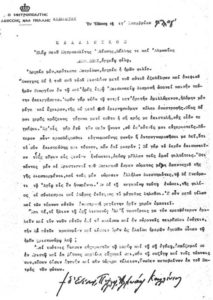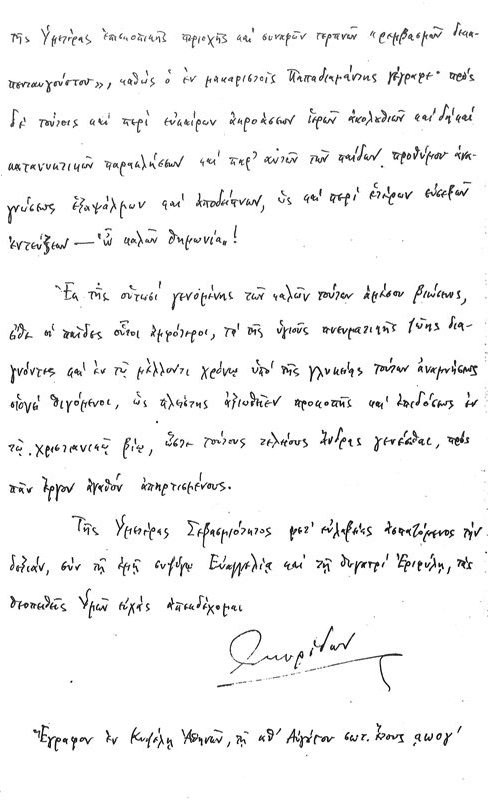 Τῆς Ὑμετέρας Σεβασμιότητος μετ’ εὐλαβείας ἀσπαζόμενος τήν δεξιάν, σύν τῇ ἐμῇ συζύγῳ Εὐαγγελίᾳ καί τῇ θυγατρί Ἐριφύλῃ, τάς θεοπειθεῖς Ὑμῶν εὐχάς ἀπεκδέχομαι