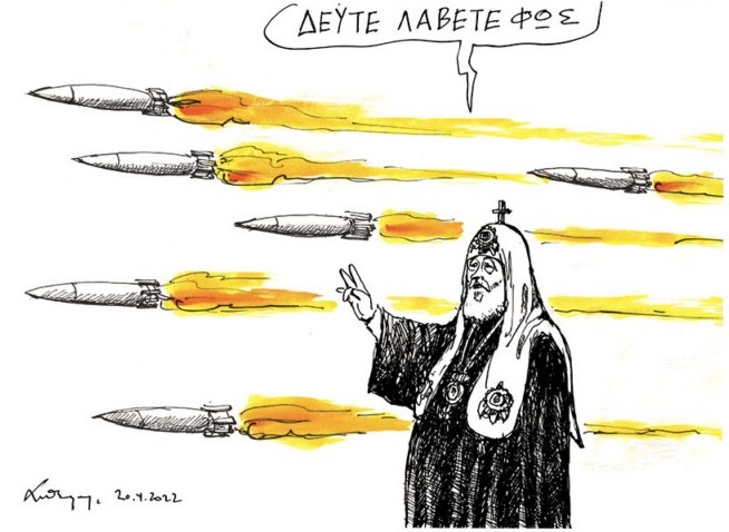 Ιδιάιτερα εύγλωττο ως προς την αποτύπωση με μια είκονα, όλω όσων καταμαρτυρούνται για τη στάση που τηρεί ο Πατριάρχης Μόσχας Κύριλλος στον συνεχιζόμενο για περισσότερους από δύο μήνες πλέον,  πόλεμο της Ρωσίας κατά της Ουκρανίας, ήταν το πασχαλινό σκίτσο για την «Καθημερινή»  του  εμβληματικού γελοιογράφου των οδυνηρών καιρών που διανύουμε, Ανδρέα Πετρουλάκη