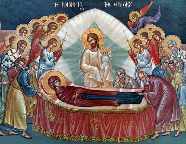 Λυγίζουνε τὰ γόνατα μπρὸς στὴν εἰκόνα τῆς Μητέρας τῆς Ζωῆς, ποὺ δέχεται χρυσοκαλόκαρδα τὰ ταπεινὰ αὐγουστιάτικα βασιλικὰ τῆς ἀγάπης καὶ τοὺς ἐκ βάθους στεναγμοὺς καὶ τὰ δάκρυα τῆς ἀποσταμένης ἐλπίδας μας, καὶ τὸ λατρευτικὸ ἀσπασμὸ τῆς πίστεως ὅσων ὁλόψυχα Τὴν ὁμολογοῦμε Κυρίως Θεοτόκον καὶ Τὴ νοιώθουμε κατάκαρδα Προστάτιν τῆς ζωῆς καὶ φρουρὰν ἀσφαλεστάτην, τῶν πειρασμῶν διαλύουσαν ὄχλον καὶ ἐπήρειας δαιμόνων ἐλαύνουσαν. Καὶ φέγγει περισσότερο ἀπ’ τὴν Αὐγουστιάτικη πανσέληνο τὸ ἅγιο πρόσωπο τῆς Θεοτόκου, ποὺ ἀναδείχθηκε διαπαντὸς ὁ γλυκασμὸς τῶν Ἀγγέλων καὶ τῶν θλιβομένων ἡ χαρά, καθὼς ἐπείγεται νὰ μεταστῆ πρὸς τὴν Ζωήν, Μήτηρ ὑπάρχουσα τῆς Ζωῆς. Γιὰ νὰ σπεύδη ἀδιάκοπα, γοργοφτέρουγη, χαριτόφορη, φωτοπλήμμυρη, ἡλιόκαλη, νὰ παρακαλῆ, νὰ στηρίζη, νὰ περισκέπη, ν’ἁγιάζη, νὰ προστατεύη καὶ νὰ λυτρώνη ἐκ θανάτου τὶς ψυχὲς Θεό-στηρίκτων, Θεο-δώρων, Θεο-φάνων, Θεο-δοσίων καὶ γενικῶς Θεο-πίστων καὶ φίλο-Θεο-μητόρων, τὶς κριματισμένες δικές μας ψυχές…