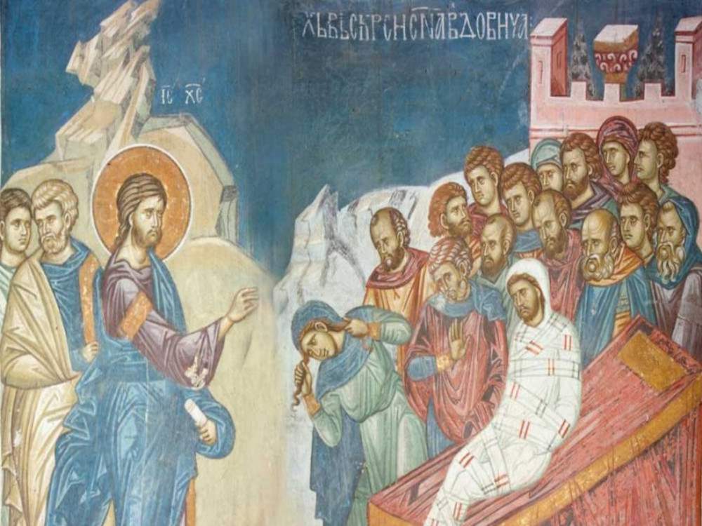Μαζί του ἦταν ἀρκετοὶ μαθητές του καὶ πολὺ πλῆθος. Τὴν ὥρα ποὺ πλησίαζαν στὴν πύλη τῆς πόλης, ἔβγαζαν ἕνα νεκρό, τὸν μονάκριβο γιὸ μιᾶς μάνας, ποὺ μάλιστα ἦταν χήρα. Κόσμος πολὺς ἀπὸ τὴν πόλη τὴ συνόδευε. Ὅταν εἶδε τὴ χήρα ὁ Κύριος, τὴ σπλαχνίστηκε καὶ τῆς εἶπε: «Μὴν κλαῖς». Ἔπειτα προχώρησε, ἀκούμπισε τὴ σορό, καὶ ἀφοῦ στὸ μεταξὺ αὐτοὶ ποὺ βαστοῦσαν τὸ φέρετρο σταμάτησαν, εἶπε: «Νεαρέ, σὲ διατάζω νὰ σηκωθεῖς». Ὁ νεκρὸς ἀνακάθισε κι ἄρχισε νὰ μιλάει. Ὁ Ἰησοῦς τὸν παρέδωσε στὴ μητέρα του».