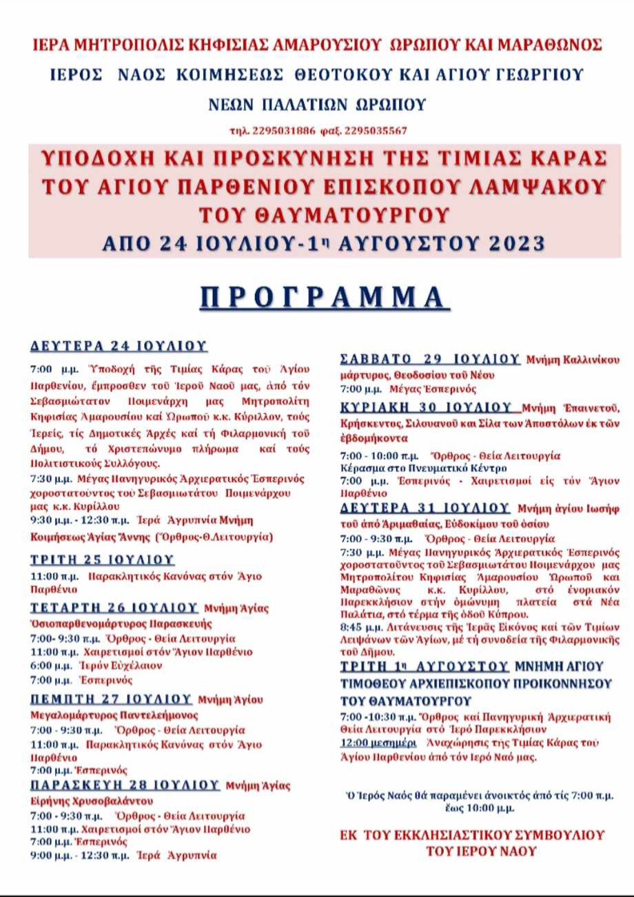 Με λαμπρότητα η Μητρόπολη Κηφισίας θα υποδεχθεί την Τιμία Κάρα του Αγίου Παρθενίου, σύμφωνα με το ακόλουθο Πρόγραμμα: