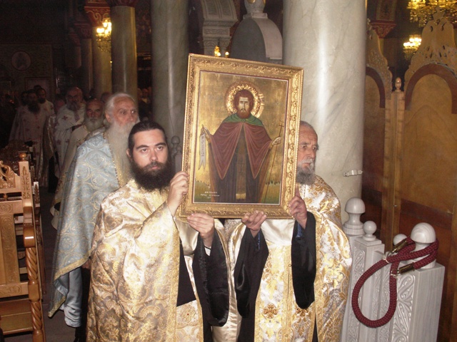 Ο μητροπολίτης Σπάρτης κ. Ευστάθιος χοροστάτησε στον πανηγυρικό εσπερινό, κατά τη διάρκεια του οποίου έγινε η ενθρόνιση της ιερής εικόνας του Αγίου στο μέσο του ναού.