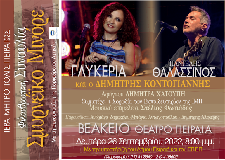 Για το σκοπό αυτό θα συμμετάσχουν οι γνωστοί καλλιτέχνες Γλυκερία, Παντελής Θαλασσινός και Δημήτρης Κοντογιάννης, οι οποίοι θα ενώσουν τις φωνές τους με σκοπό αφενός την ενίσχυση του πολύπλευρου φιλανθρωπικού έργου της τοπικής μας Εκκλησίας κατά της φτώχειας, αφετέρου την διατήρηση της ιστορικής μας μνήμης μιας και η πόλη του Πειραιά υπήρξε το πρώτο λιμάνι των κατατρεγμένων και διασωθέντων Ελλήνων.