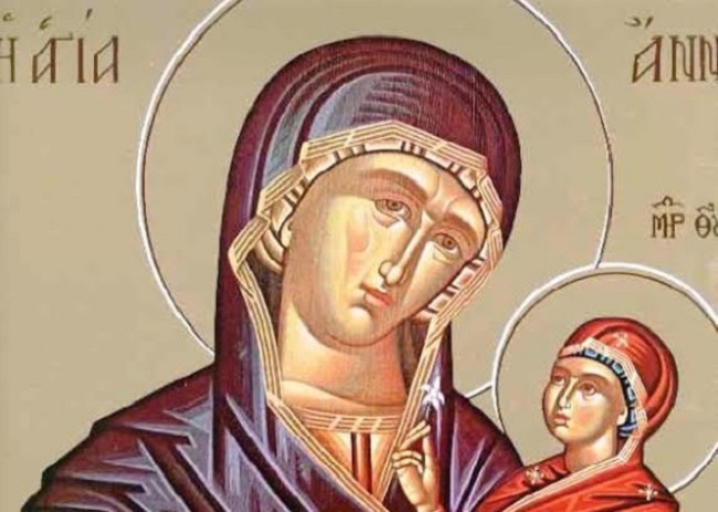 ἡ προορισθεῖσα κυοφορῆσαι τήν λαμπροτέρανἀσυγκρίτως τῶν ἡλιακῶν ἀκτίνων, ἤν προεῖδον καί προηγόρευσαν αἵ προφητικαί σάλπιγγες· ἡγνωριζόμενη ἐκ τοῦ καρποῦ αὐτῆς, τῆς βασιλίδος τῶν Ἀγγέλων καί ὑψηλοτέρας ὑπαρχούσης τῶν οὐρανῶν, ὡς σκεῦος ἐκλογῆς τοῦ Ἁγίου Πνεύματος καί χάριτος δοχεῖον διαυγέστατον· ἡ τῆς δικαιοσύνης καί ἀμέμπτου βιοτῆς καί πολιτείας εἰκών καί σωφροσύνης λειμών εὐωδής καί ἠδυπνεῦστος· ἡ ἐκπληρώσασα τά ἐν τῷ νόμω προστάγματα ἐν εὐθύτητι καρδίας καί ζεούση εὐλαβεία καί πάση ἀκριβεία μετά τοῦ μακαρίου αὐτῆς ὁμοζύγου καί θεοφόρου Ἰωακείμ· ἡ νεύσει θεία συλλάβουσα ἐν ἡλικία προβεβηκυία καί τέξασα τήν πρό αἰώνων προορισθεῖσαν γενέσθαι Μητέρα Θεοῦ· ἡ τοῦ πανοικτήρμονος καί πανευϊλάτου Θεοῦ προμῆτορ, ἡ ἑτοίμη ἀντίληψις καί προστασία τῶν εἰς σέ καταφευγόντων ἐκ πίστεως, ἡ παραμυθία τῶν καταπονουμένων καίἀνάψυξις τῶν τεθλιμμένων, ἡ τάς ἀτεκνούσας καί στειρευούσας γυναίκας εὐτεκνούσαςἀποδεικνύουσα τή τοῦ Ἐγγονοῦ σου χάριτι, προσδεξαι καί τήν δέησιν ἠμῶν τῶν ἁμαρτωλῶν καί τήν δυσθυμίαν τῆς ἀπαιδίας τῶν ἱκετῶν σου εἰς εὐθυμίαν παιδοποιϊας μεταποίησον.