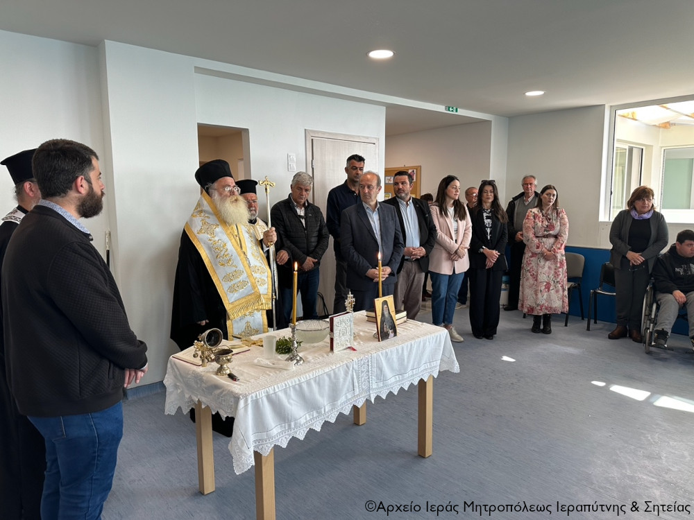 Σε κλίμα έκδηλης ικανοποίησης το πρωί της Τετάρτης 30 Απριλίου 2025 ο Σεβ. Μητροπολίτης Ιεραπύτνης και Σητείας κ. Κύριλλος τέλεσε τον Αγιασμό στο νέο κτίριο λειτουργίας του Κ.Δ.Α.Π. Α.μ.ε.Α. του Δήμου Ιεράπετρας, παρουσία του Δημάρχου Εμμανουήλ Φραγκούλη και άλλων εκπροσώπων της δημοτικής αρχής, εργαζομένων, ωφελουμένων και μελών των οικογενειών των ωφελουμένων της δομής.