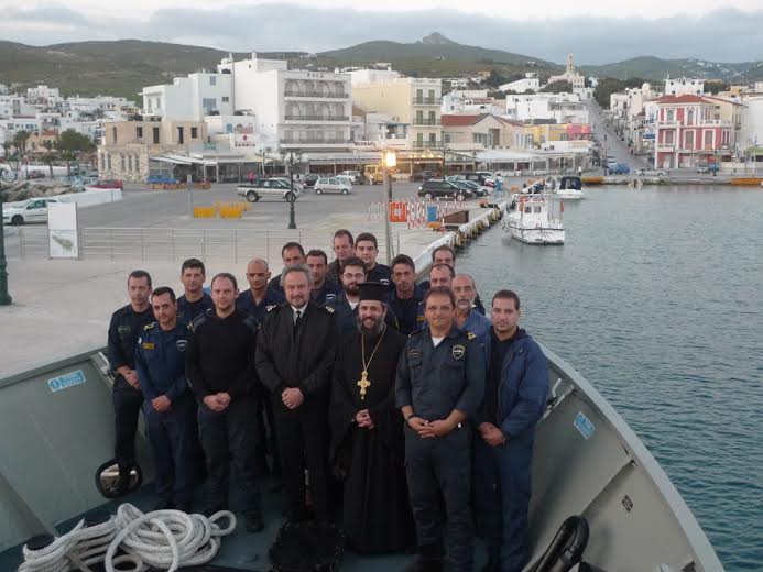 Ο Κυβερνήτης απ την πλευρά του, προσέφερε στον ιερέα τον θυρεό του πλοίου και τον ξενάγησε αναφερόμενος στην αποστολή των πλοίων της Υδρογραφικής Υπηρεσίας του Πολεμικού Ναυτικού.