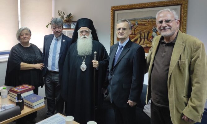 Μετά το πέρας της τελετής, τον Σεβασμιώτατο δέχθηκε στο γραφείο του ο Αναπληρωτής Καθηγητής του Τμήματος κ. Σωτήριος Μπαλατσούκας, με τον οποίο είχε εγκάρδια συνομιλία.