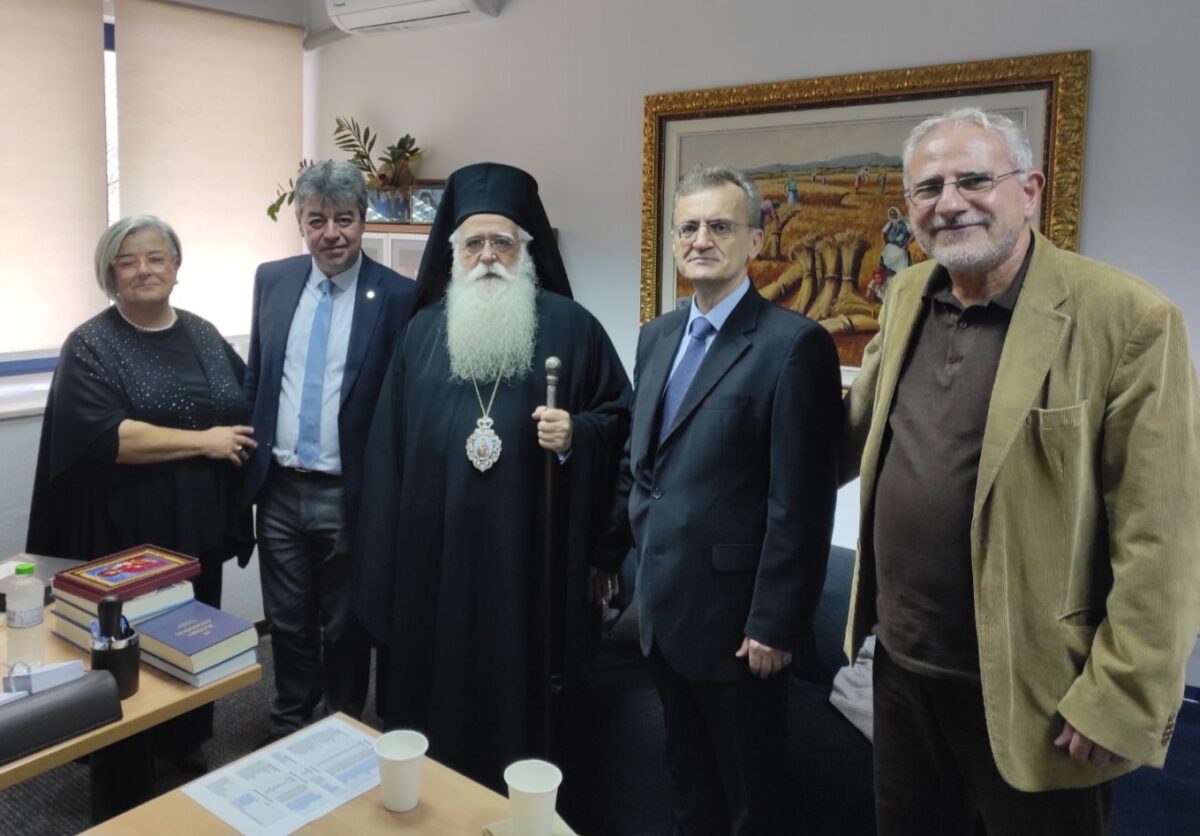 Μετά το πέρας της τελετής, τον Σεβασμιώτατο δέχθηκε στο γραφείο του ο Αναπληρωτής Καθηγητής του Τμήματος κ. Σωτήριος Μπαλατσούκας, με τον οποίο είχε εγκάρδια συνομιλία.