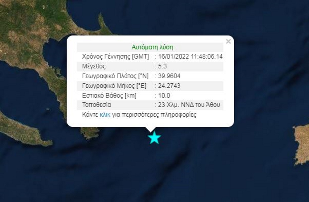 Ο ισχυρός σεισμός των 5,4R της Κυριακής (16.01.2022) έχει επίκεντρο τη θαλάσσια περιοχή 20 χιλιόμετρα νότια – νοτιοδυτικά του Άθου. Το δε εστιακό βάθος της δόνησης βρίσκεται στα 19,3 χιλιόμετρα.