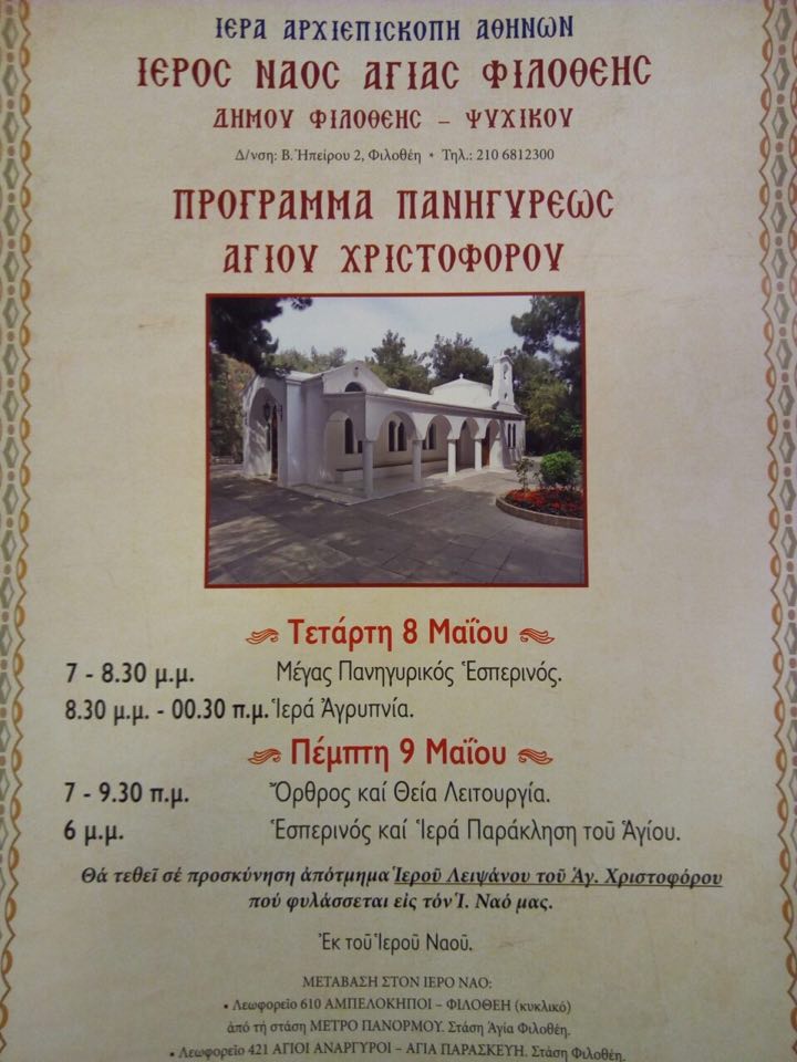 Προς προσκύνηση και ευλογία των πιστών θα τεθεί σήμερα 08 Μαΐου και αύριο 09 Μαΐου ανήμερα του Αγίου Χριστοφόρου, το ιερό λείψανο του Αγίου προστάτη των οδηγών, στον ιερό ναό Αγίας Φιλοθέης Αττικής, Δήμου Φιλοθέης – Ψυχικού.