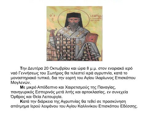 Την Δευτέρα 20 Οκτωβρίου και ώρα 8 μ.μ. στον ενοριακό ιερό ναό Γεννήσεως του Σωτήρος Κρύας Βρύσης θα τελεσθεί ιερά Αγρυπνία (Μικρό Απόδειπνο με τους Χαιρετισμούς της Παναγίας, Εσπερινός με Λιτή, Αρτοκλασία, Όρθρος και Θεία Λειτουργία) για την εορτή του Αγίου Ιλαρίωνος, Επισκόπου Μογλενών. Κατά την διάρκεια της Αγρυπνίας θα τεθεί σε προσκύνηση απότμημα ιερού […]