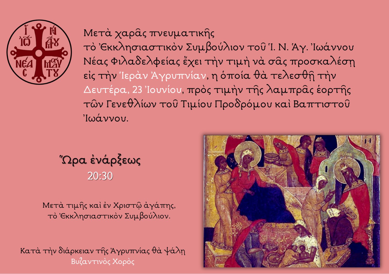 Σήμερα, Δευτέρα 23 Ιουνίου 2025, στις 20:30 μ.μ., στον Ι. Ναό Αγίου Ιωάννου Φιλαδέλφειας, θα τελεστεί Αγρυπνία για την εορτή του Γενεθλίου του Τιμίου Προδρόμου.