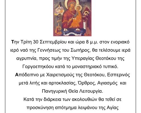 Την Τρίτη 30 Σεπτεμβρίου και ώρα 8.00 μ.μ. στον ενοριακό ιερό ναό Γεννήσεως του Σωτήρος Κρύας Βρύσης θα τελεσθεί ιερά Αγρυπνία (Εσπερινός με Λιτή, Αρτοκλασία, Όρθρος με Αγιασμό και Θεία Λειτουργία) για την εορτή της Συνάξεως της Υπεραγίας Θεοτόκου της Γοργοεπηκόου. Κατά την διάρκεια της Αγρυπνίας θα τεθεί σε προσκύνηση απότμημα ιερού λειψάνου της Αγίας […]