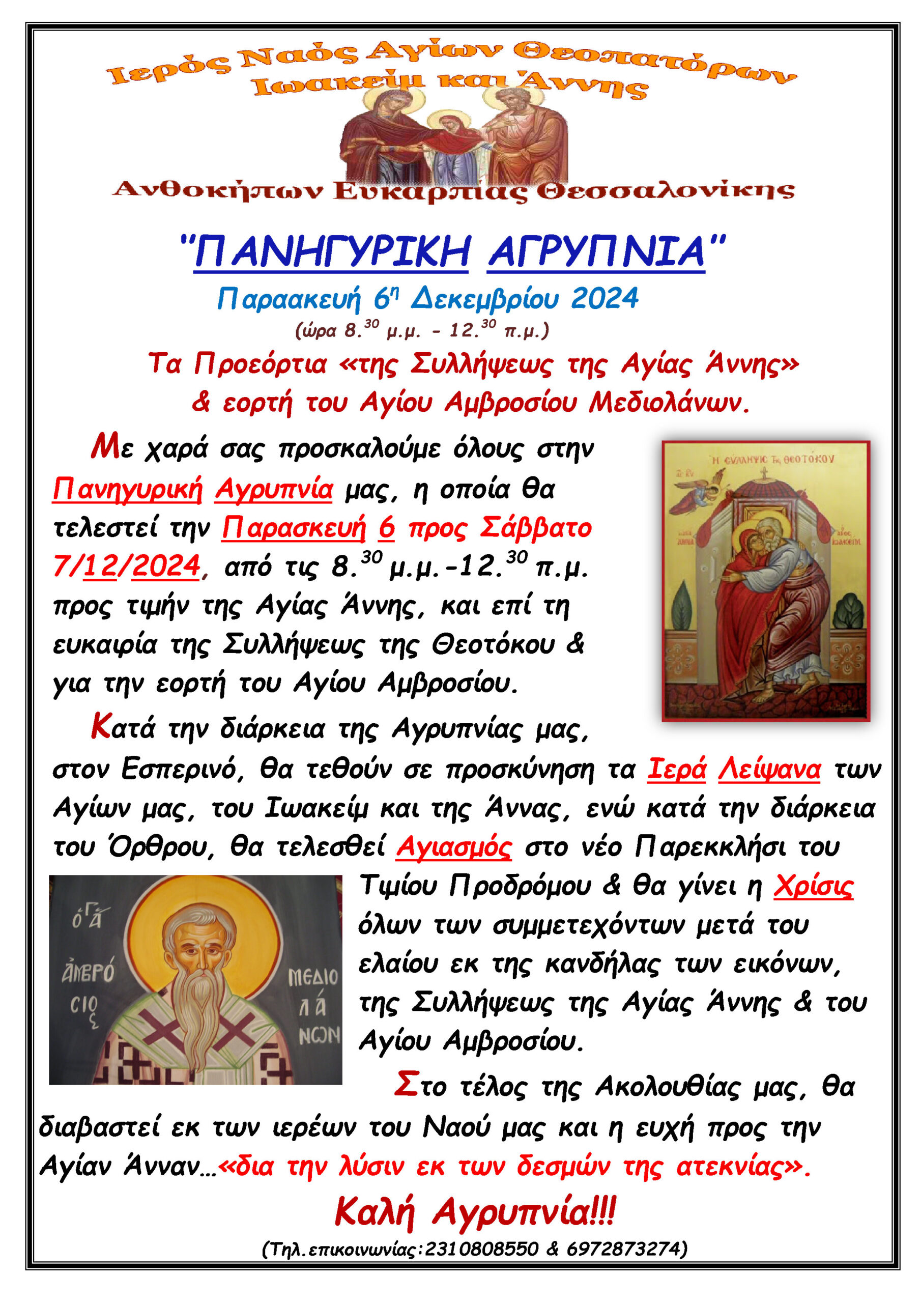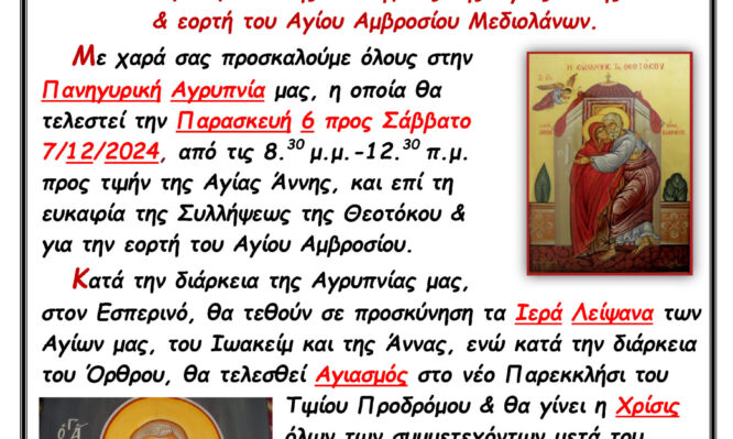 Αγρυπνία για τον Άγιο Αμβρόσιο, Επίσκοπο Μεδιολάνων θα τελεστεί στη Μητρόπολη Νεαπόλεως, σύμφωνα με το ακόλουθο Πρόγραμμα: