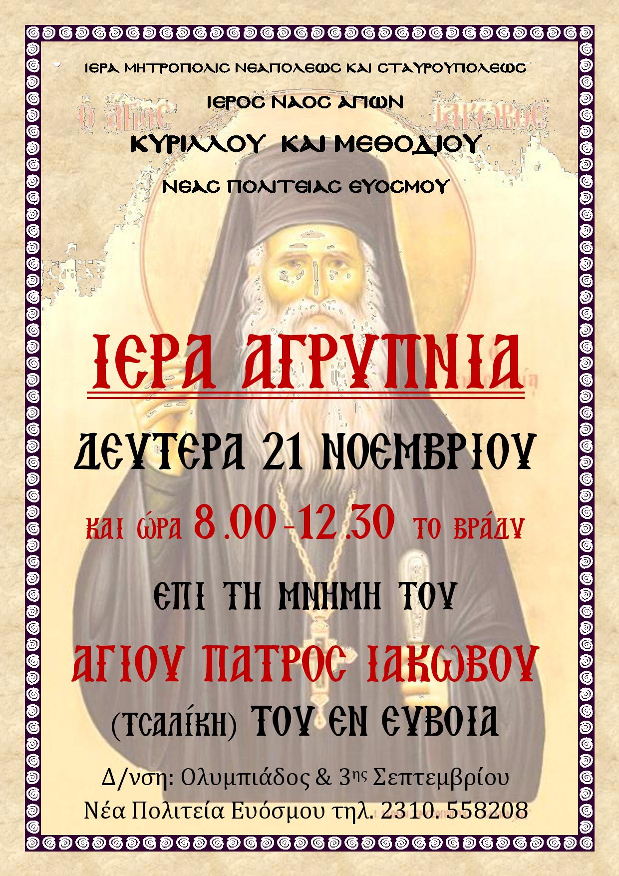 Αγρυπνία θα τελεσθεί σήμερα, Δευτέρα, 21 Νοεμβρίου 2022 στη Μητρόπολη Νεαπόλεως και Σταυρουπόλεως για τη μνήμη του Οσίου Ιακώβου Τσαλίκη, σύμφωνα με το κάτωθι Πρόγραμμα: