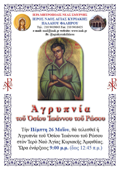 Στον Ι. Ναό Αγίας Κυριακής Αμφιθέας, της Μητροπόλεως Νέας Σμύρνης, την Πέμπτη, 26 Μαΐου 2022, θα τελεστεί Αγρυπνία, από 21:00 – 00:45 π.μ., προς τιμήν του Οσίου Ιωάννου του Ρώσου.