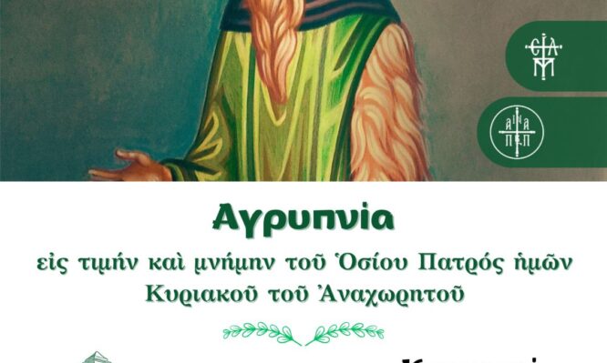 Την Κυριακή 28 Σεπτεμβρίου από ώρα 9.00 μ.μ. έως 12.30 π.μ. στον ιερό ενοριακό ναό Αγίων Αποστόλων Πέτρου και Παύλου Γιαννιτσών θα τελεσθεί ιερά Αγρυπνία για την εορτή του οσίου και θεοφόρου Πατρός ημών Κυριακού του Αναχωρητού.