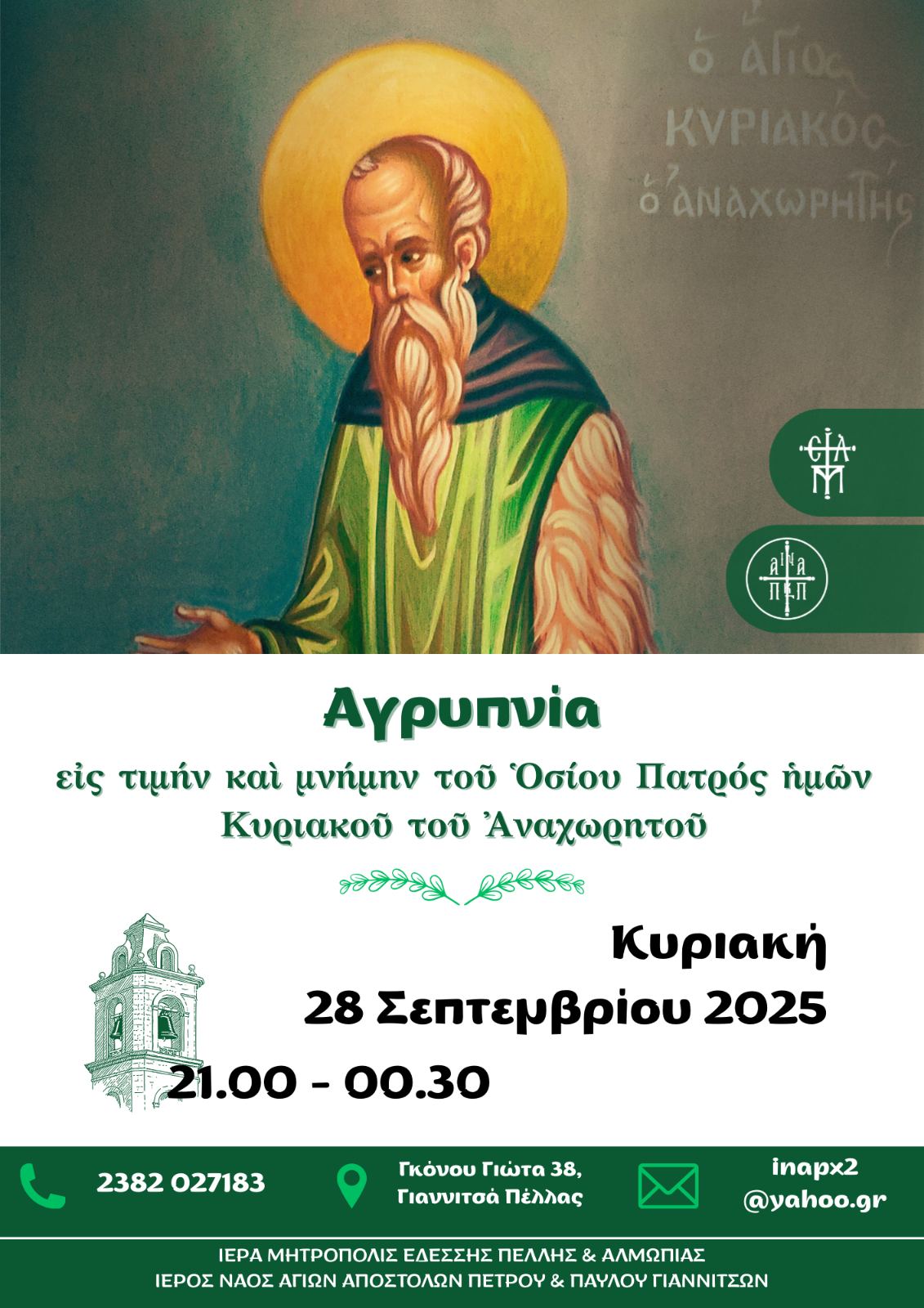 Την Κυριακή 28 Σεπτεμβρίου από ώρα 9.00 μ.μ. έως 12.30 π.μ. στον ιερό ενοριακό ναό Αγίων Αποστόλων Πέτρου και Παύλου Γιαννιτσών θα τελεσθεί ιερά Αγρυπνία για την εορτή του οσίου και θεοφόρου Πατρός ημών Κυριακού του Αναχωρητού.