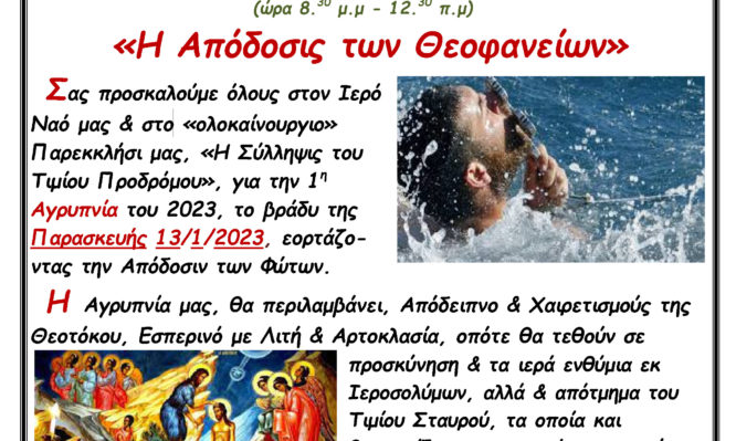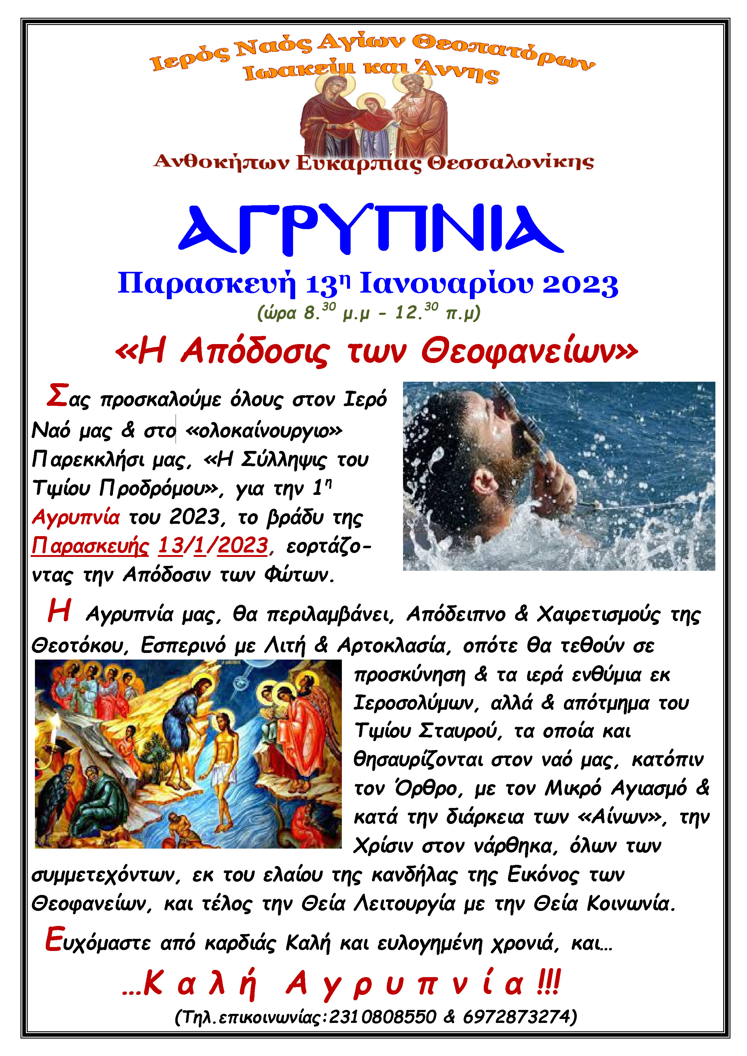 Την Παρασκευή, 13 Ιανουαρίου 2023, θα πραγματοποιηθεί Ι. Αγρυπνία στον Ι. Ναό Αγίων Ιωακείμ και Άννης, στη Μητρόπολη Νεαπόλεως, για την απόδοση της εορτής των Θεοφανείων.
