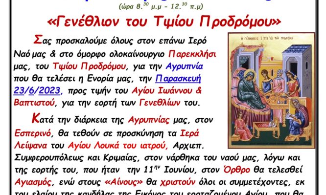 Αγρυπνία θα τελεσθεί στον Ι.Ν.Αγίων Θεοπατόρων Ιωακείμ και Άννης, της Μητροπόλεως Νεαπόλεως και Σταυρουπόλεως, την Παρασκευή, 23 Ιουνίου, σύμφωνα με το κάτωθι Πρόγραμμα: