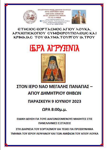 Αγρυπνία στον Ιερό Ναό Μ. Παναγίας Θηβών ΕΛΛΑΔΑ, ΜΗΤΡΟΠΟΛΕΙΣ 09.06.2023 | 18:33 Αγρυπνία για τον Άγιο Λουκά τον Ιατρό στη Θήβα Αγρυπνία θα τελεσθεί απόψε, στον Ιερό Ναό Μ.Παναγίας Θηβών, σύμφωνα με το ακόλουθο Πρόγραμμα: